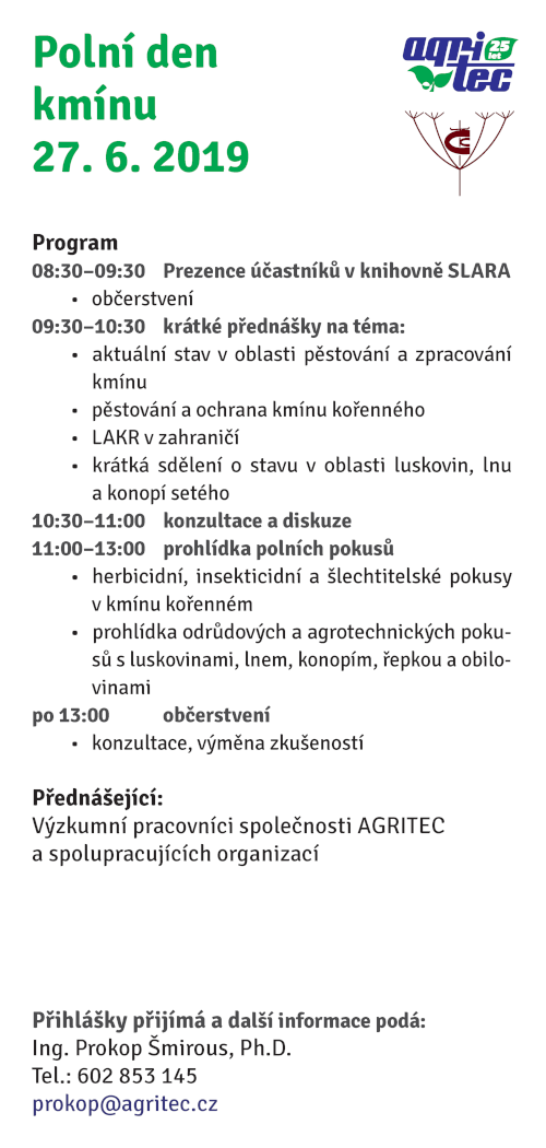 AGRITEC, výzkum, šlechtění a služby, s.r.o., Asociace pěstitelů a zpracovatelů luskovin z.s., Svaz lnu a konopí ČR, z.s. a Český kmín, z.s. si Vás dovolují pozvat na Polní dny luskovin (26. 6. 2019), lnu, konopí a kmínu (27. 6. 2019).